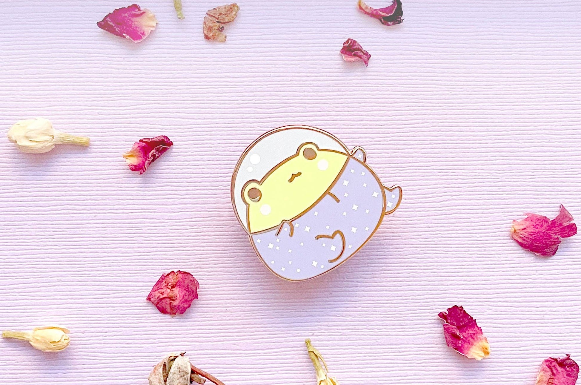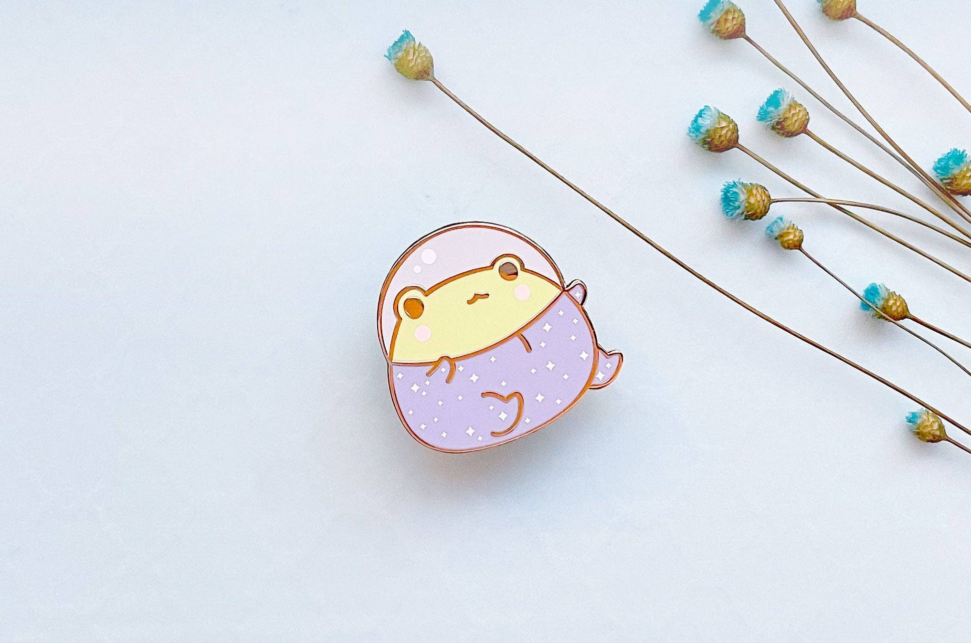 This cute Space Frog Gogo enamel pin features my Gogo the Frog character floating in a starry spacesuit. This hard enamel pin is set on a highly-polished gold-plated metal with two posts on the back and measures around 1.25".