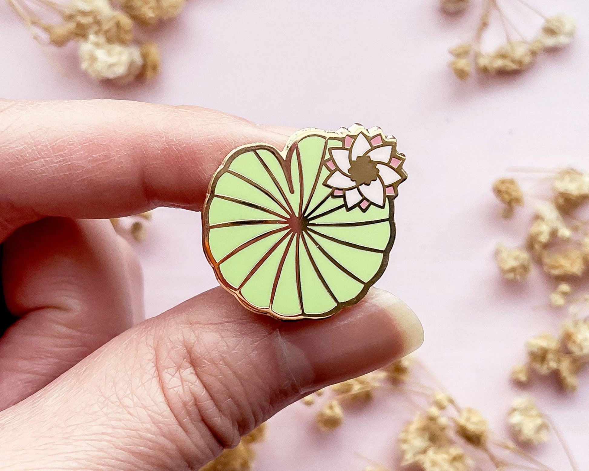 This cute mini water lily pad enamel pin features a small and charming lily pad with a water lily in the corner. This pin is a smaller version of my lily pad needle minder. This cute pin is the perfect accent for your lapels, shirts, backpacks, bags pin displays and more. its small size makes it easy to place in many different places and its minimalist color palette and design makes it easy to match and style. This pin is 1" in size is set in gold-plated metal. It has a single post on the back.