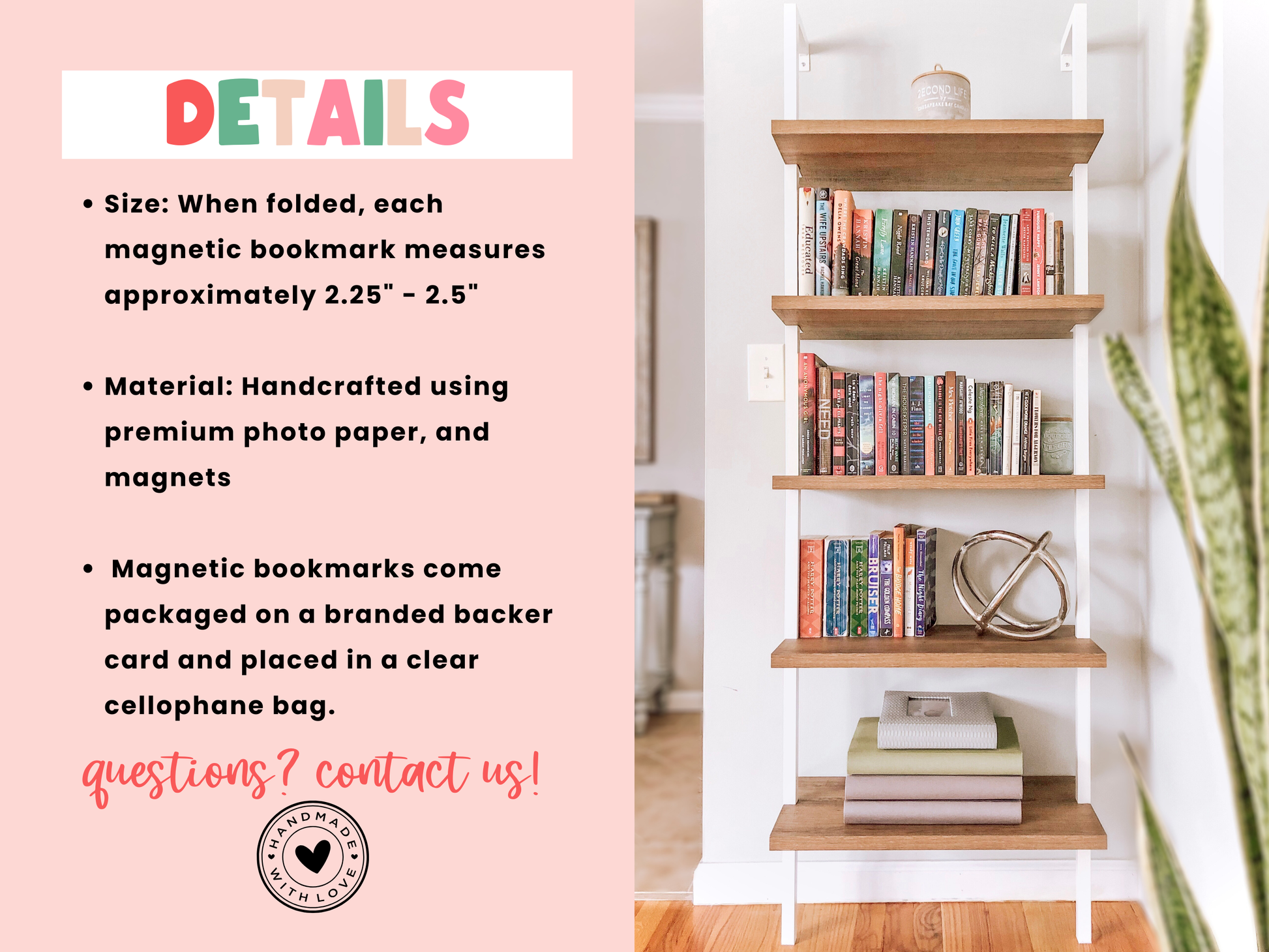 * Size: When folded, magnetic bookmarks measure approximately 2.25" - 2.5"
